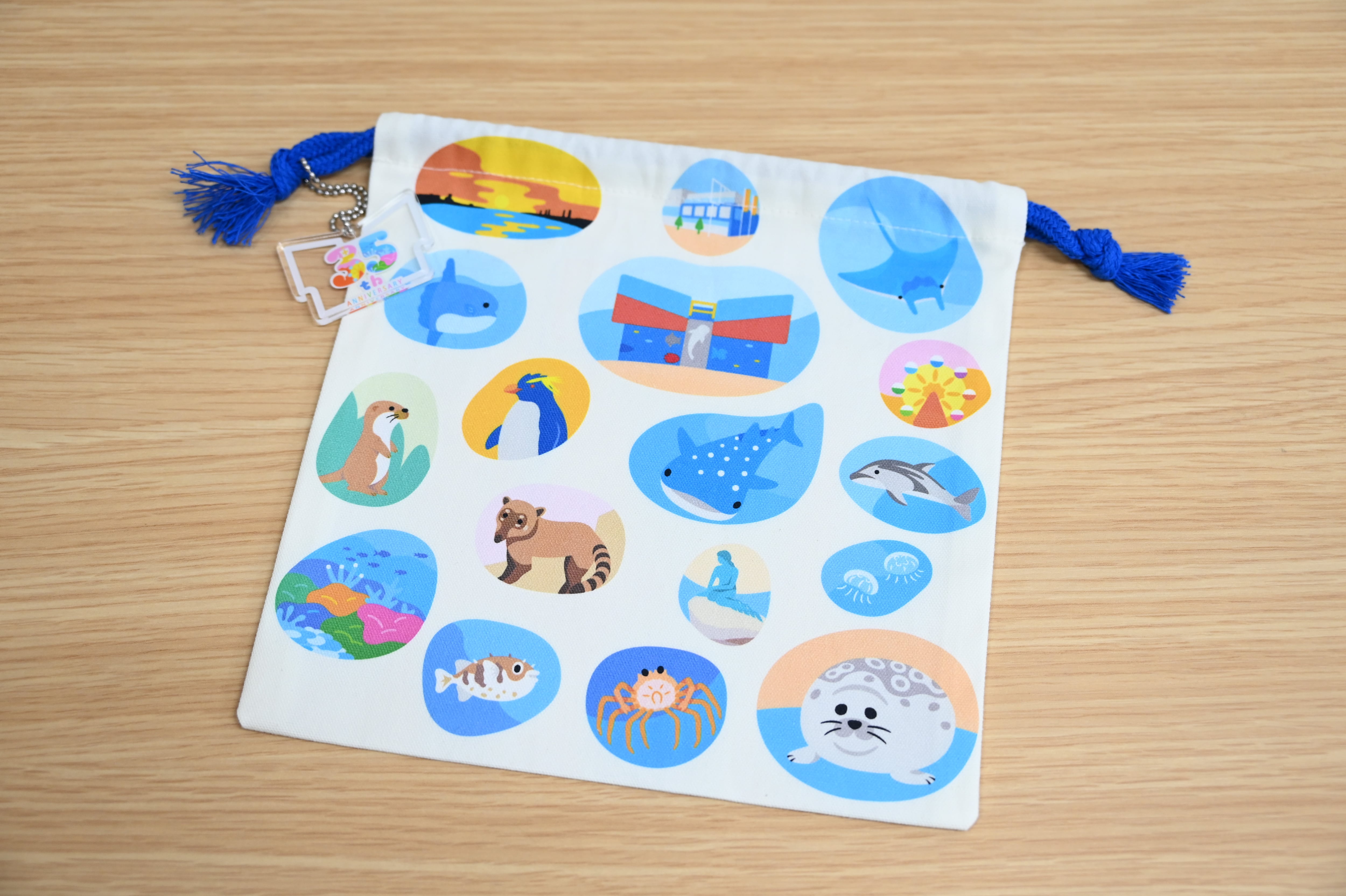 海遊館35周年デザインの巾着袋が登場しました。海遊館の建物型アクリルキーホルダー付きです。
